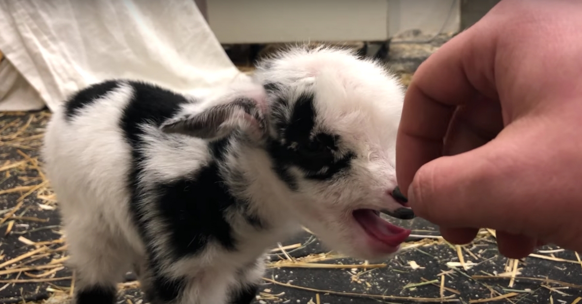 Hij aait dit baby geitje. Let op wat er gebeurt als hij daarmee stopt!